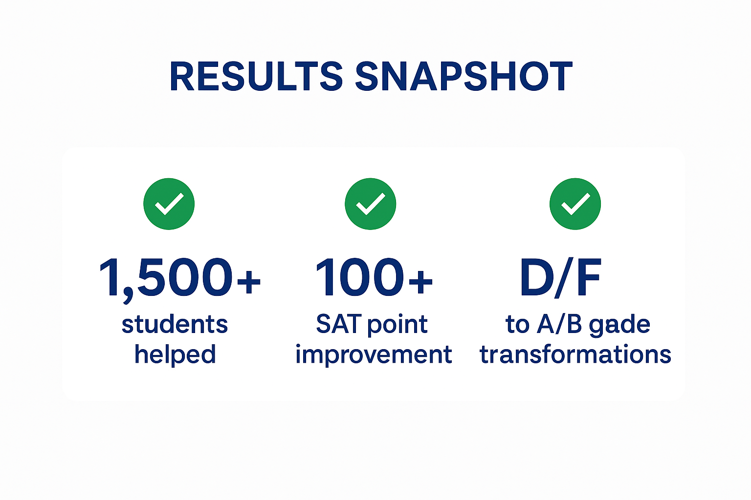 For over a decade, Iβve helped more than 1,500 students succeed, from middle school to college, by turning math struggles into confidence and results. My approach is friendly, energetic, and effective, helping students move from failing grades to Aβs and Bβs, and boosting SAT scores by 100+ points.